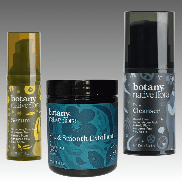 Begin with the Silk & Smooth Exfoliant, a gentle pine and coconut scrub that removes surface buildup and dull skin cells without irritation, leaving the skin smooth, soft and renewed. Follow with Botany Native Flora Face Cleanser, which effectively washes away impurities and excess oil while supporting hydration. Enriched with vitamin C rich Australian native extracts, it leaves the skin feeling clean, calm and refreshed. Complete your routine with the Botany Native Flora Serum, a lightweight, fast absorbing formula infused with native botanicals and ascorbyl glucoside, a stable vitamin C derivative that helps brighten complexion, protect against environmental stressors and support a more even, youthful looking skin tone.